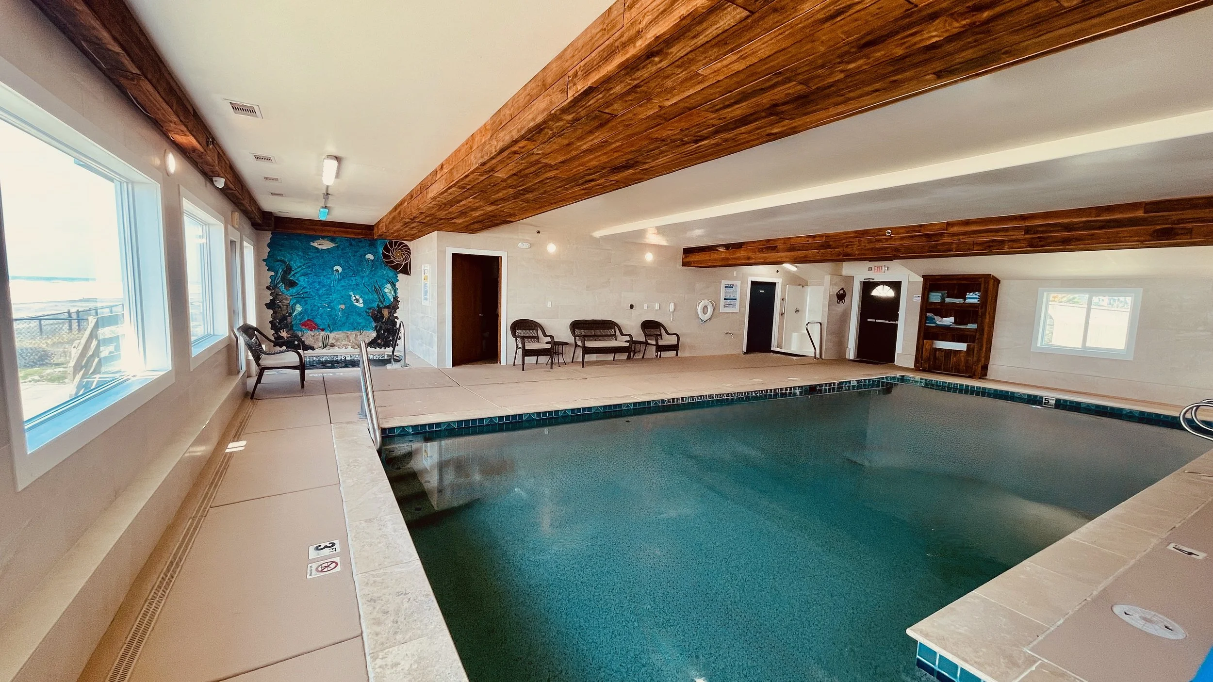 Indoor heated salt water pool with corner hot tub, both with an ocean view to enjoy.